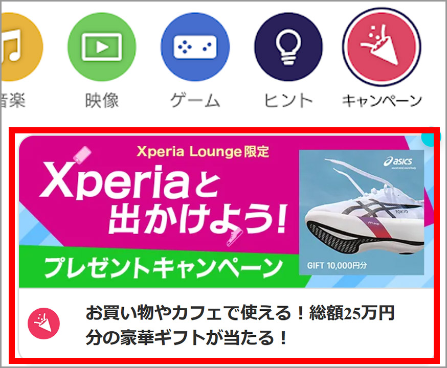 トップページのキャンペーンボタンから「Xperiaと出かけよう!プレゼントキャンペーン」のカードをタップします。