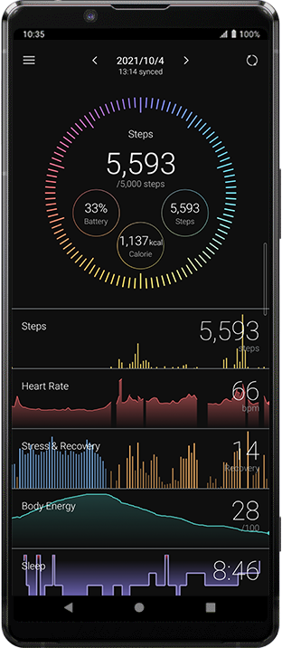 wena 3では、加速度センサーとデュアル光学式心拍センサー搭載により、日々の活動データを取得可能。ソニー独自のアルゴリズムを搭載し、運動時に限らず日常の健康管理にもより正確に役立てることができます。アプリではwena 3本体から取得したデータを管理・閲覧いただけます。