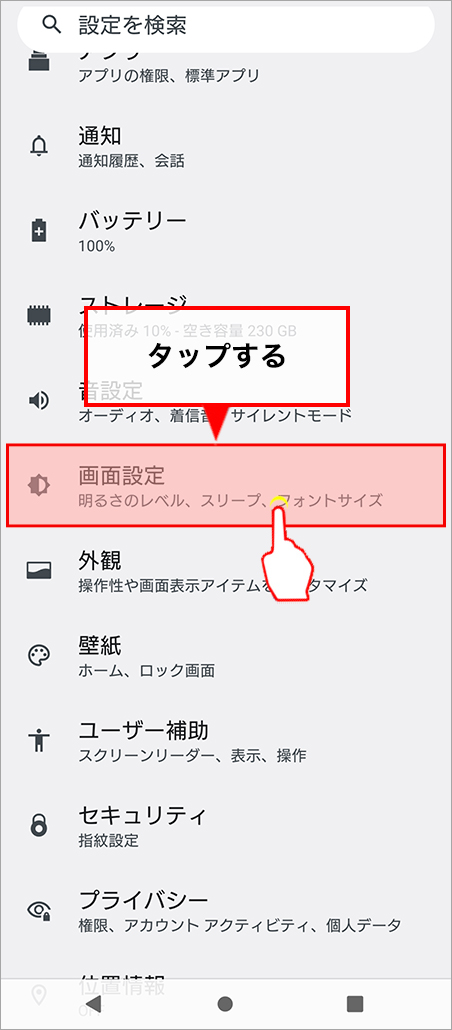 設定画面から「画面設定」を選びます。