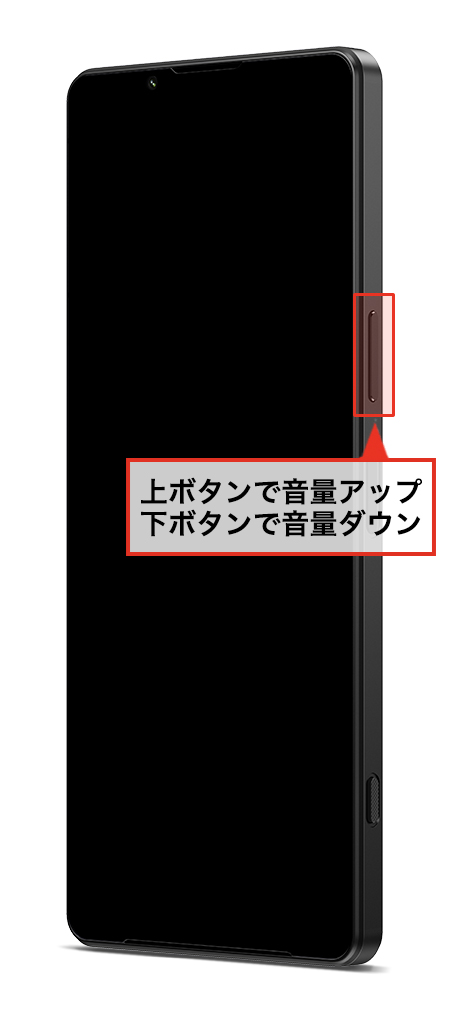 端末の右側面にある音量ボタンでは、何もしていない状態、あるいは着信中なら電話の着信音量、ミュージックアプリやビデオアプリで再生中なら音楽の音量を調整できます。上ボタンで音量が大きくなり、下ボタンで音量が小さくなります。