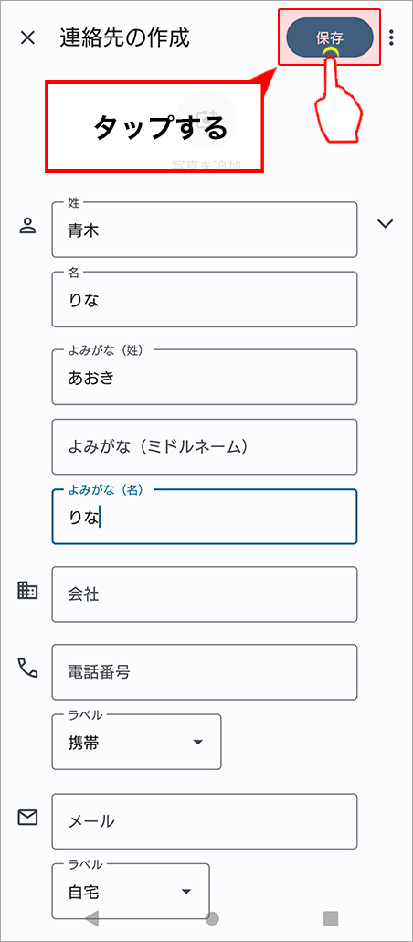 登録したい電話番号や相手の名前などのデータを入力。入力し終えたら画面右上の「保存」をタップします。