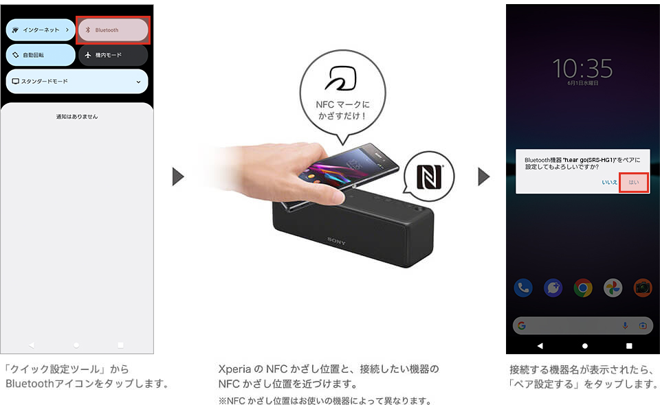 XperiaはNFC機能を搭載しているので、NFC対応のヘッドホンやスピーカーにかざすだけでかんたんにペアリングできます。