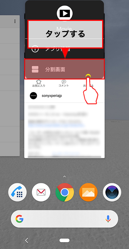 分割表示したいアプリ(今回だと動画アプリ)のアイコンをタップします。
