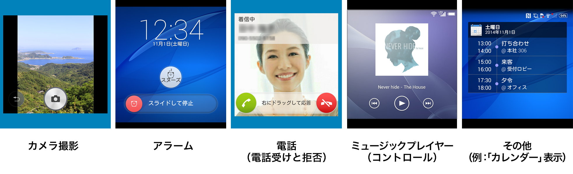 カメラ撮影、アラーム操作、電話着信応答、ミュージックプレーヤーのコントロールが可能。その他、カレンダーなどのロックスクリーンウィジェットを操作することもできます。