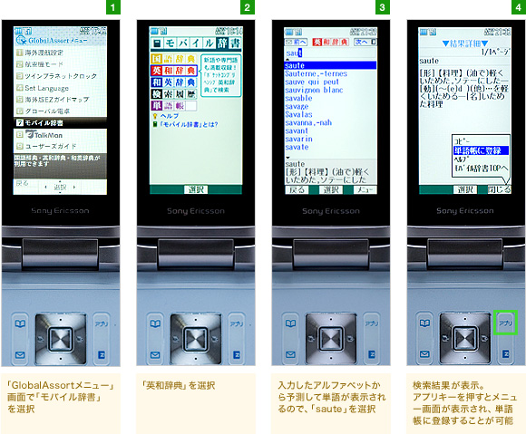 海外旅行や出張でよく使う、会話集を収録した「TalkManFlash」。挨拶などの日常会話から、体調不良・パスポートの紛失など、旅先でのトラブル時などで使える会話集も収録されています。「W64S」には英語、中国語、フランス語がプリセット。「発声」機能がついているので、発音が分からないときでも代わりにしゃべってくれるから便利。語学の教材としても活躍します。現地でのショッピング時を例に、会話集の使い方を見てみましょう!