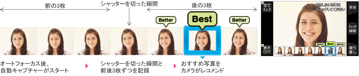 撮影した中から、ブレが少なく笑顔がキレイに撮れた写真をケータイがおすすめします。