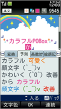 予測候補に色付きの単語や語句を表示します。また、予測候補に表示された単語や語句は、アドレス帳キーを押すことにより、文字色・文字サイズの変更もできます。英語予測にも対応し、カラフルなメールの作成も簡単です。