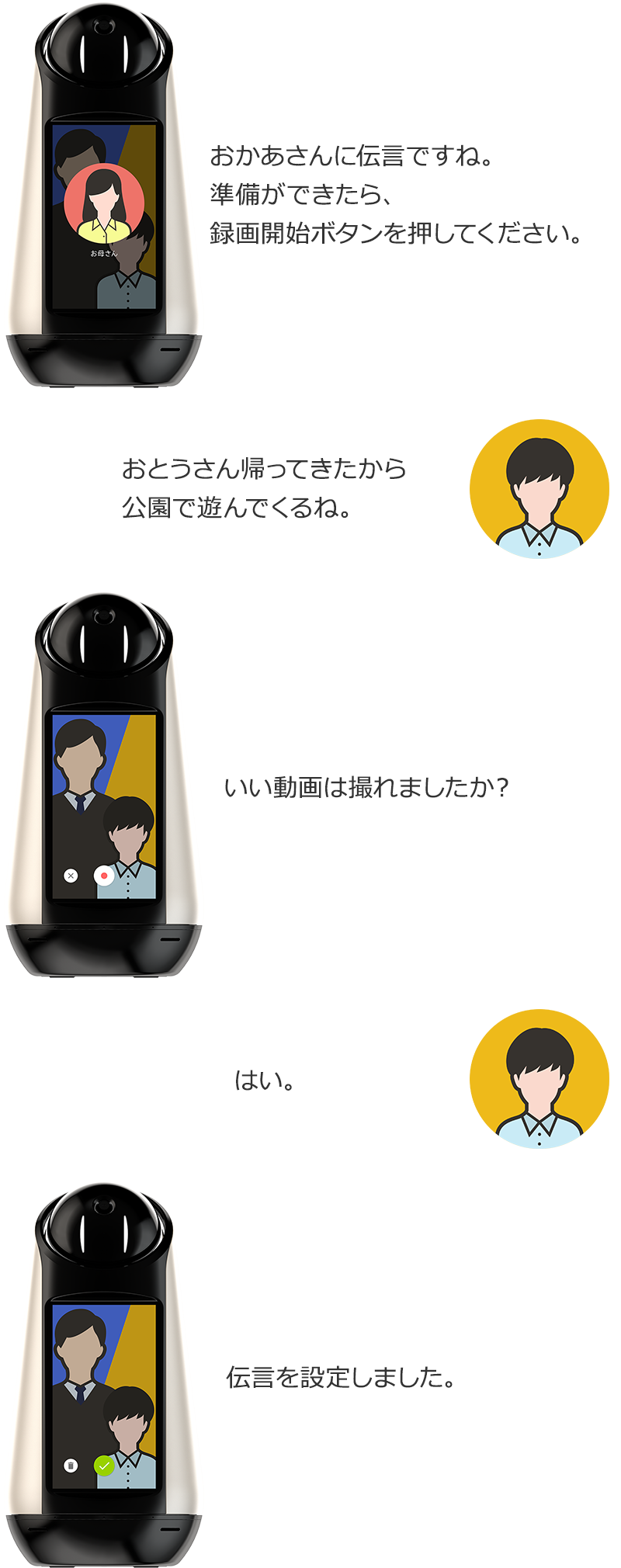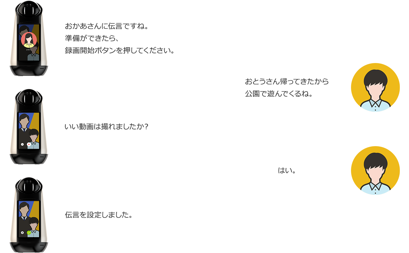 Xperia Hello!にビデオ伝言を残せます。「伝言をおねがい」と伝えて、届けたいユーザーを指定します。次に、カメラが立ち上がるので、録画ボタンを押して伝言を残します。Xperia Hello!は、届けたいユーザーを認識すると能動的にお知らせします。