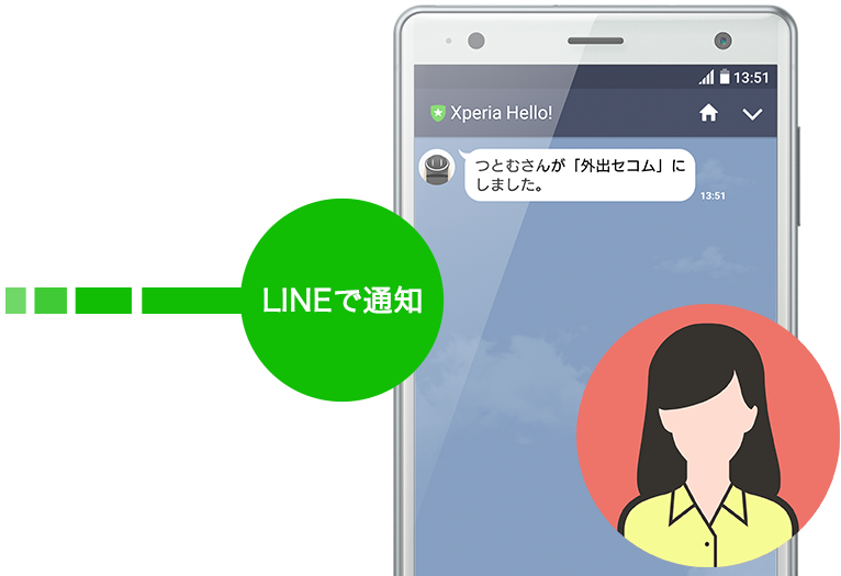 LINEを使って、外出先から家の中の様子を確認できます。Xperia Hello!が家族を見かけた時間を確認したり、家の中を撮影して写真で確認することができます。