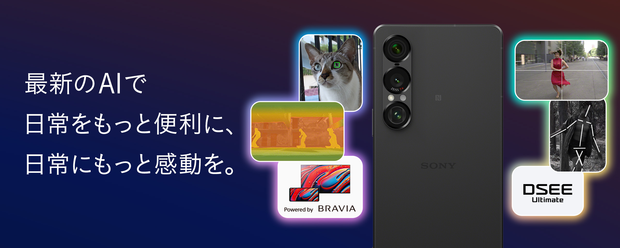 ソニーのデジタル一眼カメラ「α™(Alpha™)」や、ポータブルオーディオプレーヤー「ウォークマン®」、テレビ「ブラビア™」といった専用機に搭載されている最先端の技術と各領域で培ったAI技術を、Xperia™向けに最適化した「Xperia Intelligence」によって、撮影でも視聴でも高い次元の体験価値をリアルタイムに実現します。