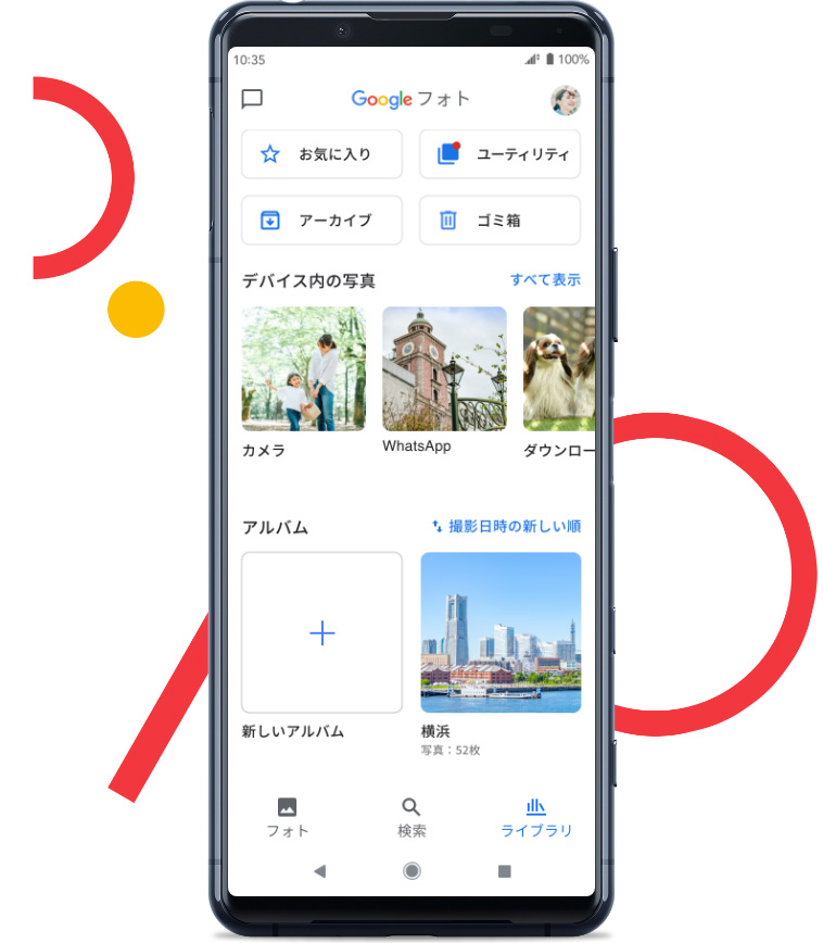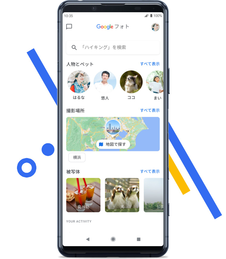 Google フォトが自動で写真を整理。たくさんの写真からでも検索機能を使ってすぐに見つけられます。