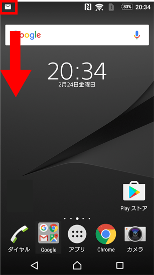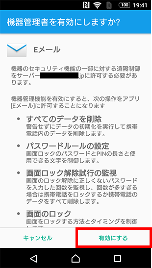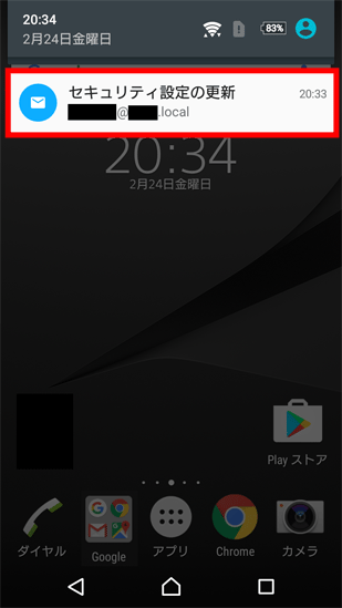 EASポリシーの自動更新時もしくは、Eメールアプリの更新時に、ステータスバーに通知アイコンが表示され、選択すると左画面のポップアップを表示いたします。(画面遷移は下記手順)
