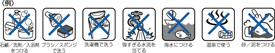 • 万一、塩水や海水、清涼飲料水がかかったり、泥や土などが付着したりした場合には、すぐに洗い流してください。乾燥して固まると、汚れが落ちにくくなり、傷や故障の原因となります。