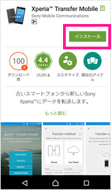 転送先の対象XperiaにGoogle PlayストアからXperia Transfer Mobileアプリをインストールします。「インストール」ボタンをタップして、確認事項に同意していただくとインストールが開始されます。インストールされたアプリを開いてください。