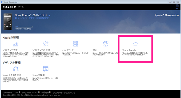 Xperia Companionを起動した状態で、転送先の対象Xperiaをお使いのPCとケーブルで接続します。メニュー上に「Xperia Transfer」が表示されますので、クリックしてください。