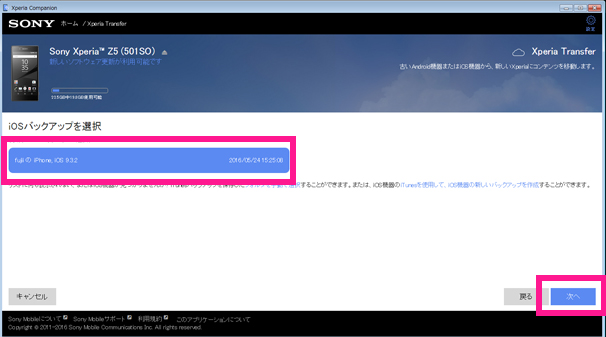 転送元のスマートフォンの選択画面が表示されます。対象のスマートフォンを選択して、「次へ」ボタンをクリックしてください。