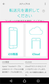 転送方法の選択画面が表示されます。転送先の対象Xperiaと転送元のiPhoneをケーブルで直接接続する場合は「iOS機器」、クラウド経由でコンテンツを転送する場合は「iCloud」を選択してください。