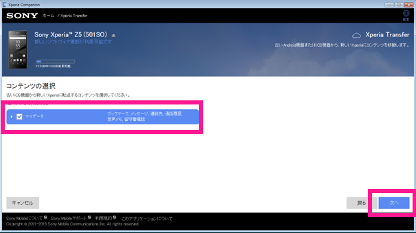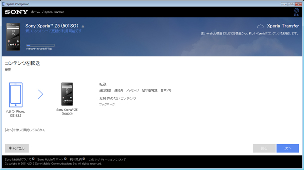 ※転送元、転送先の機器の組み合わせ、また機器の環境によっては、Xperia Transferで転送できるコンテンツの種類に制限がある場合があります。