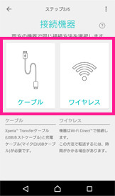 「直接転送」の場合は、接続機器が「ケーブル」か「ワイヤレス(Wi-Fi)」かの選択画面が表示されます。接続方法を選択してください。