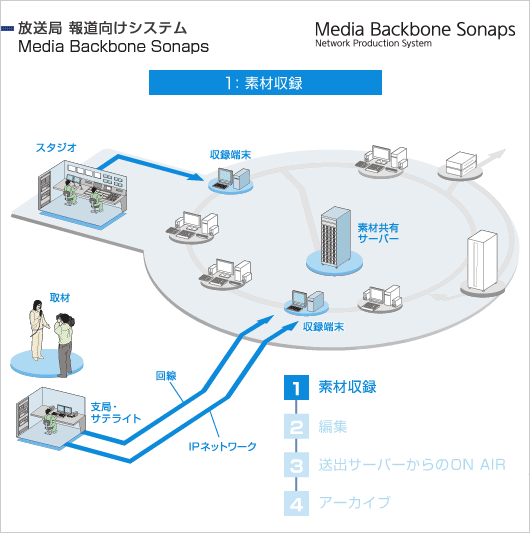映像素材のファイル化と局内外のインフラのネットワーク化が急速に進む中、取材/回線収録から編集/送出/アーカイブまで、効率的なワークフローを実現するのがネットワーク報道制作システム<Media Backbone Sonaps>です。